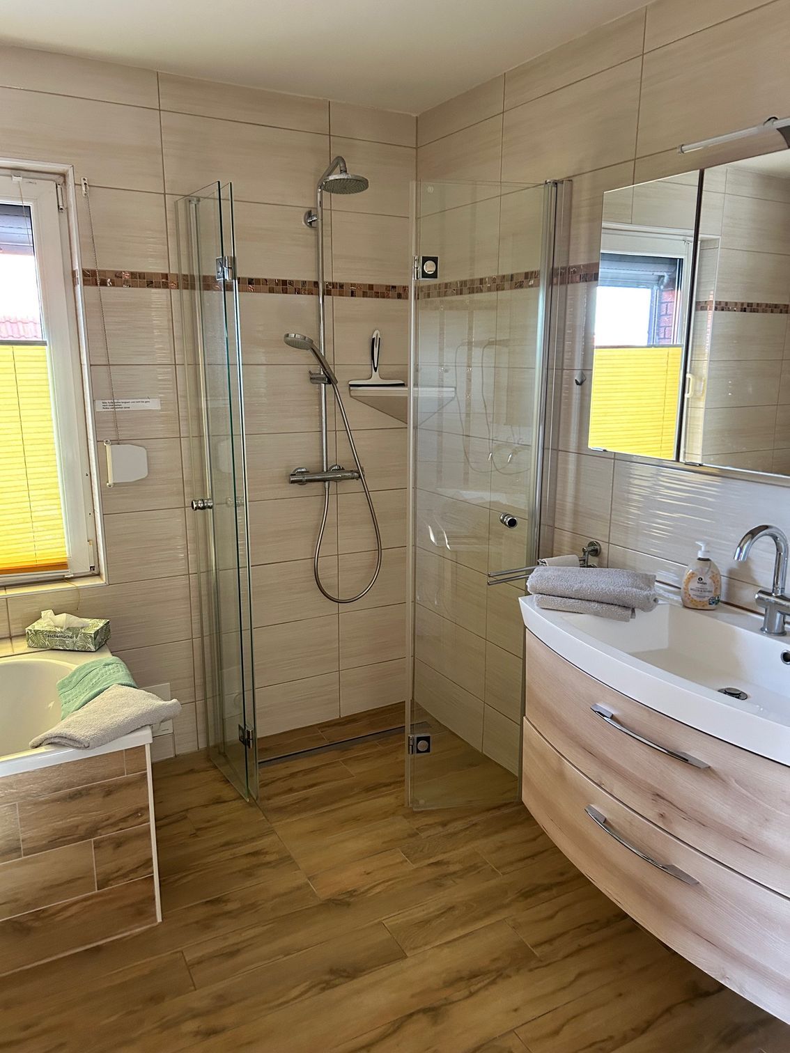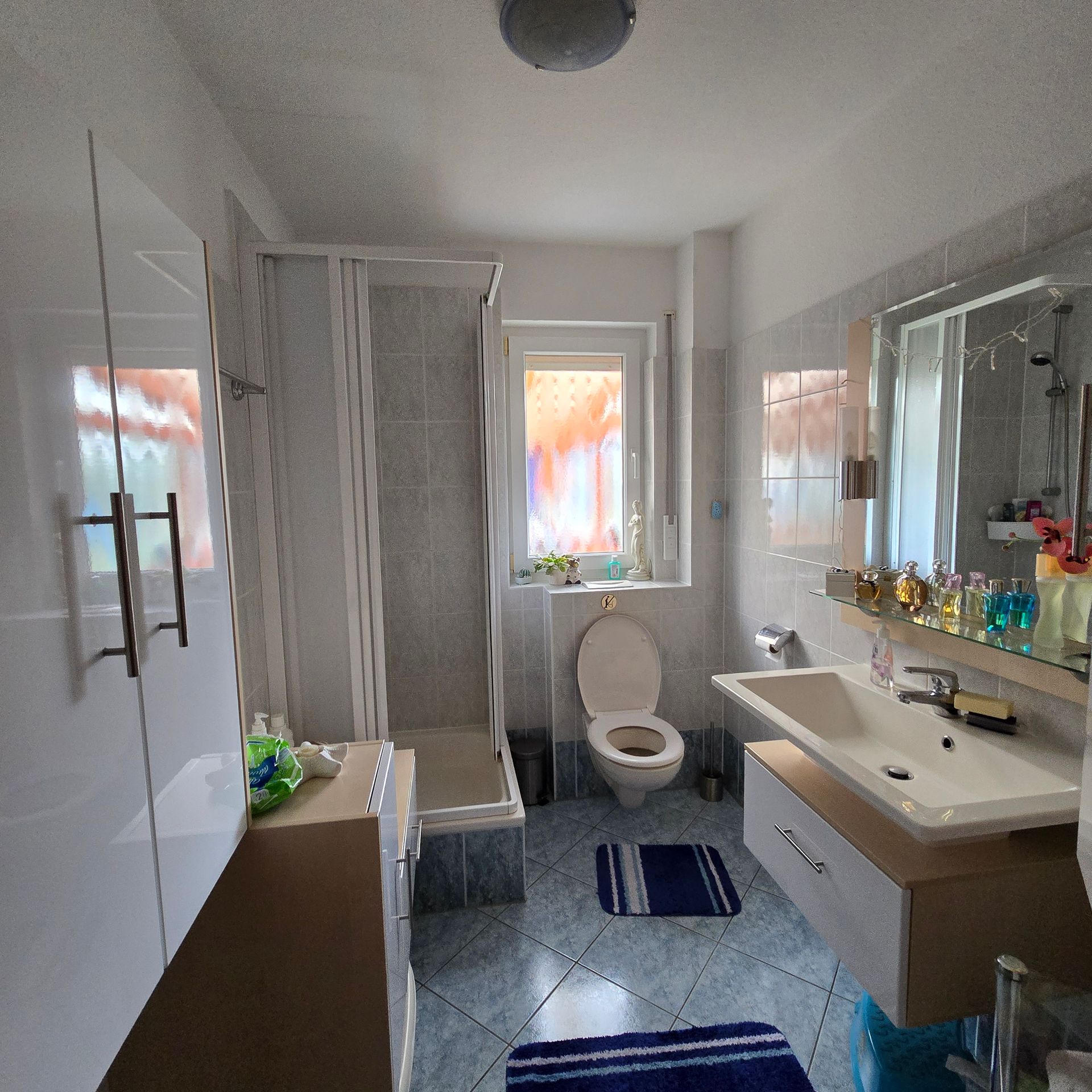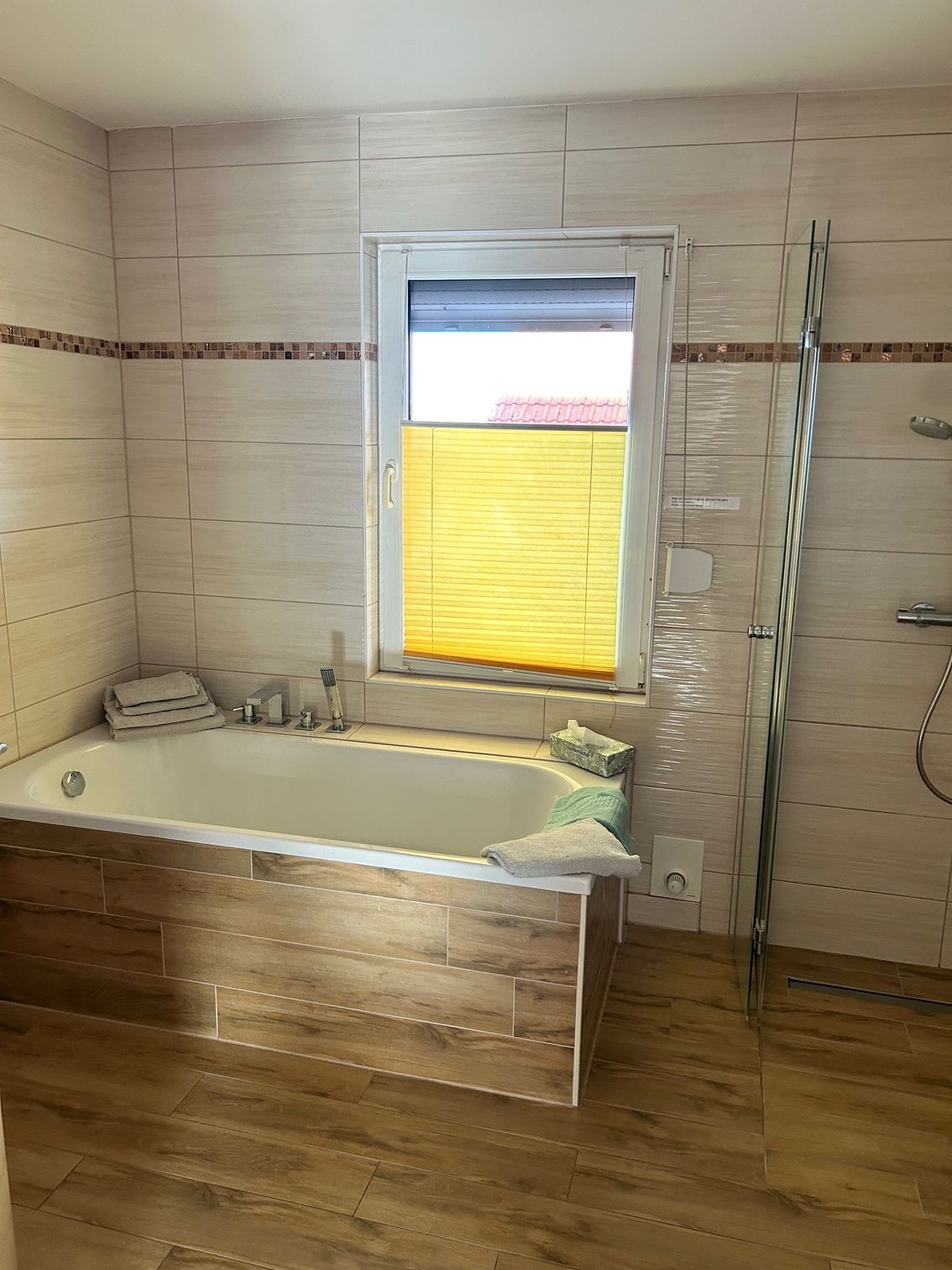 Das Badezimmer verwöhnt mit Dusche und Badewanne gleichermaßen – für schnelle Erfrischung oder entspannte Auszeiten. Ein separates Gästebad sorgt für zusätzlichen Komfort im Alltag.