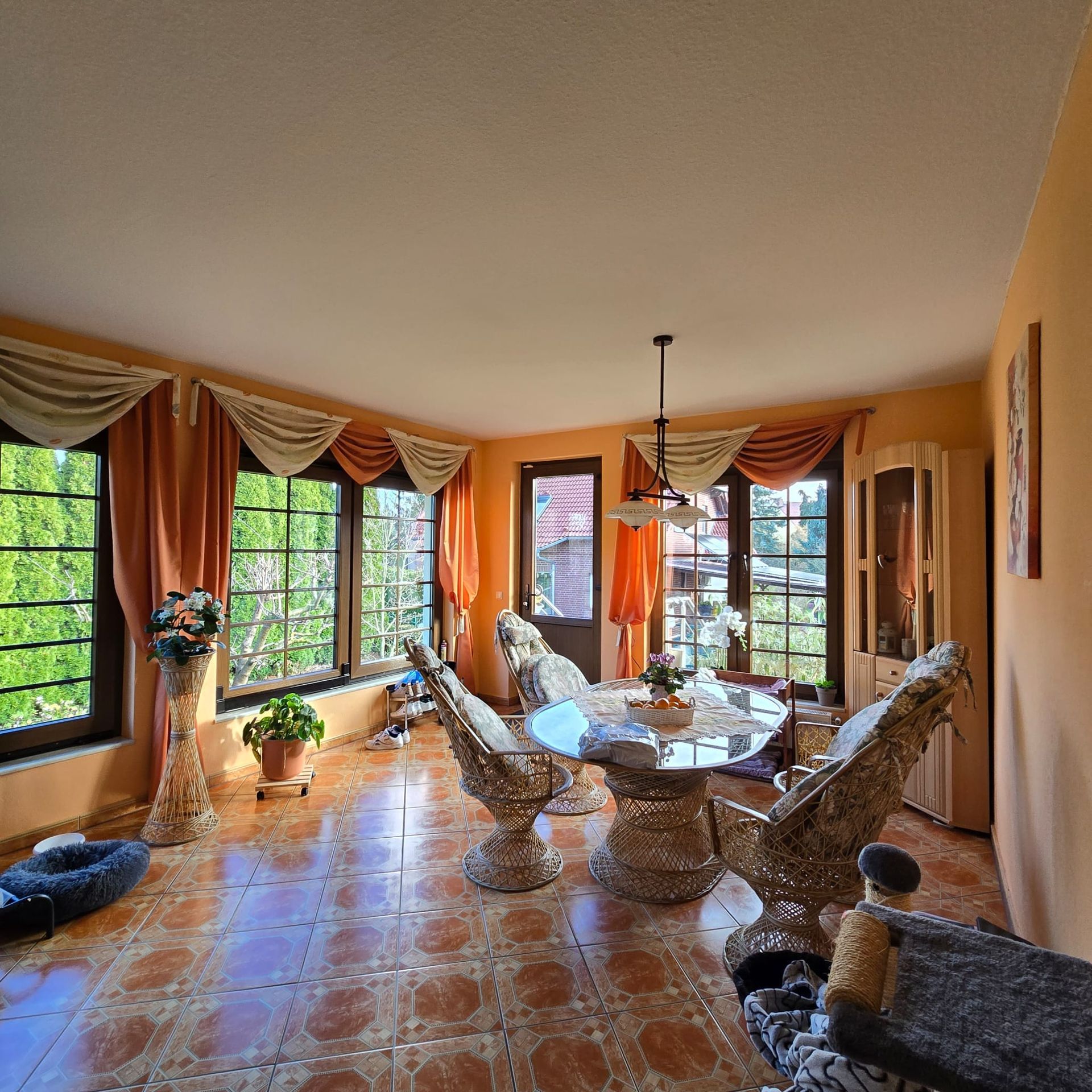 Ein besonderes Highlight ist der Wintergarten, der 2006 in hochwertiger Bauweise angebaut wurde. Mit seinen ca. 22 m² lädt er zu jeder Jahreszeit dazu ein, die Ruhe des Gartens zu genießen – ob in der Morgensonne oder eingehüllt in die Atmosphäre eines gemütlichen Abends.