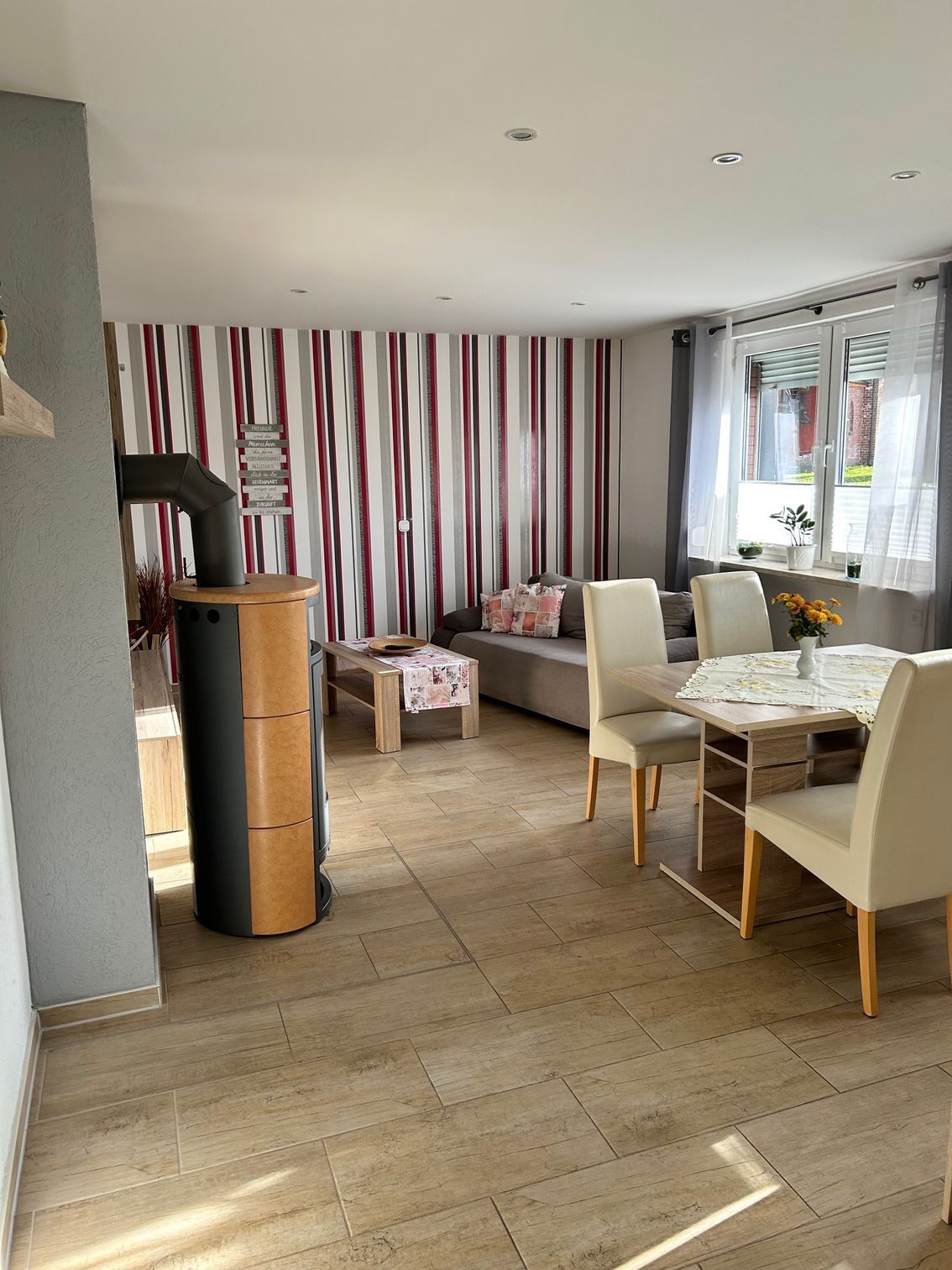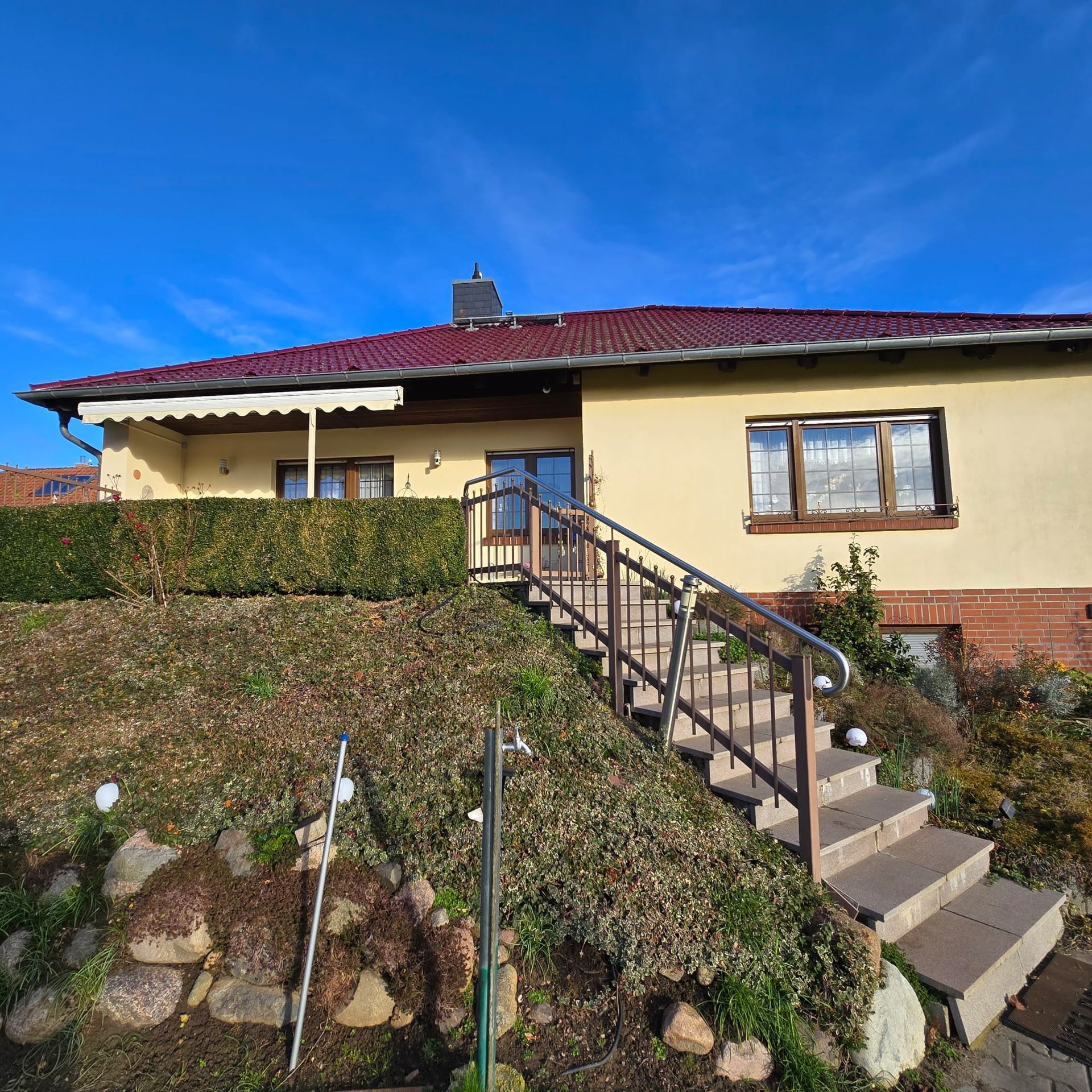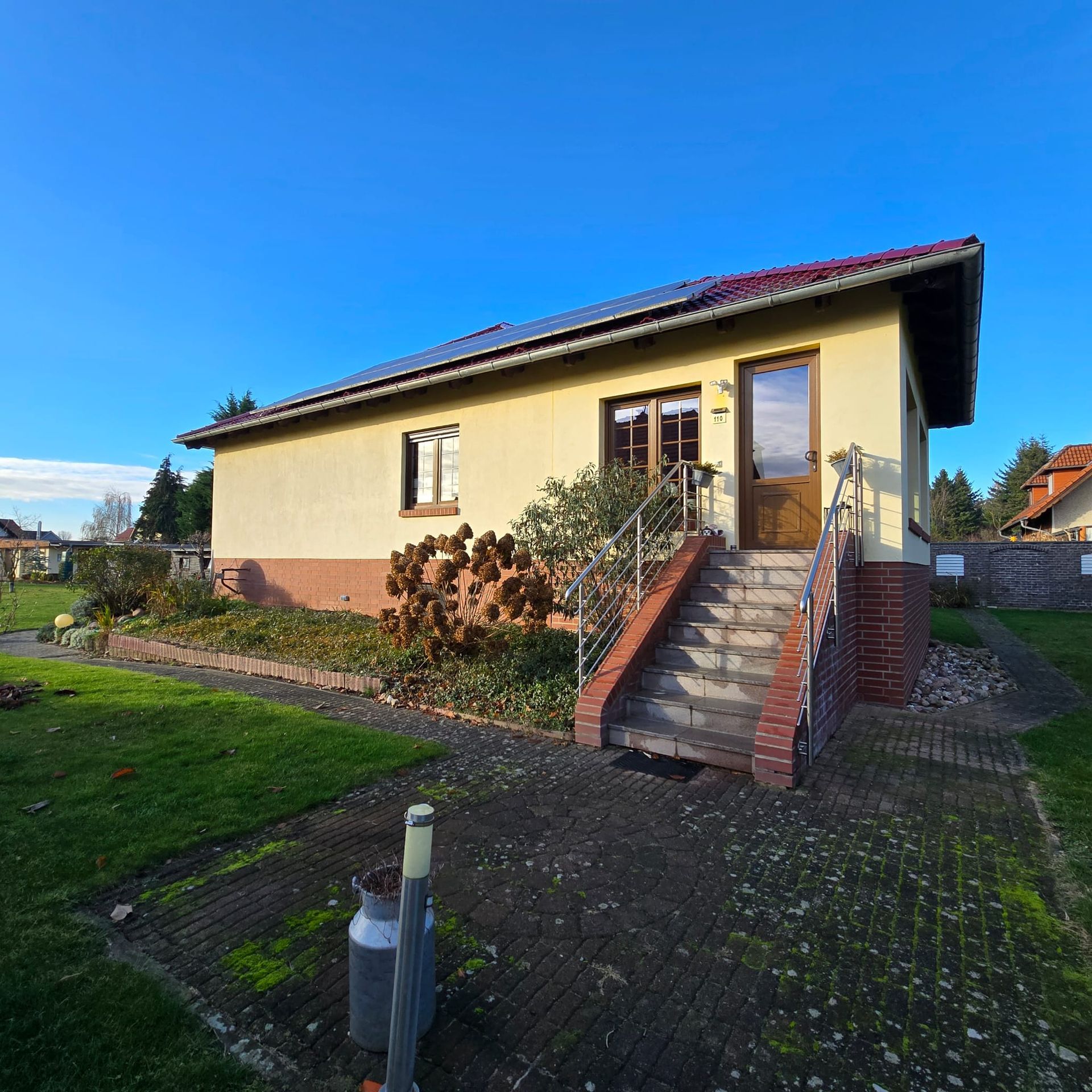 Dieser liebevoll gestaltete Bungalow bietet Wohnen auf einer Ebene – barrierefrei, offen und hell. Das Herzstück des Hauses bildet das großzügige Wohnzimmer mit festgemauertem Kamin, das besonders in der kalten Jahreszeit für eine behagliche Atmosphäre sorgt.