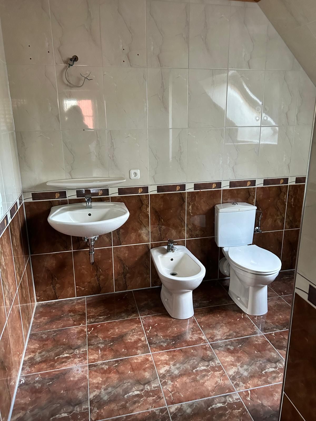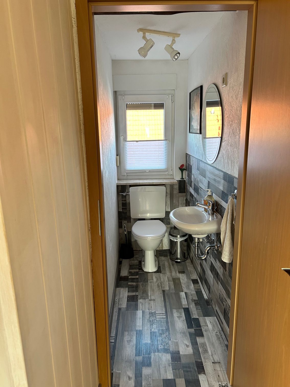 Zusätzlich gibt es ein Bad mit Toilette und Waschbecken.