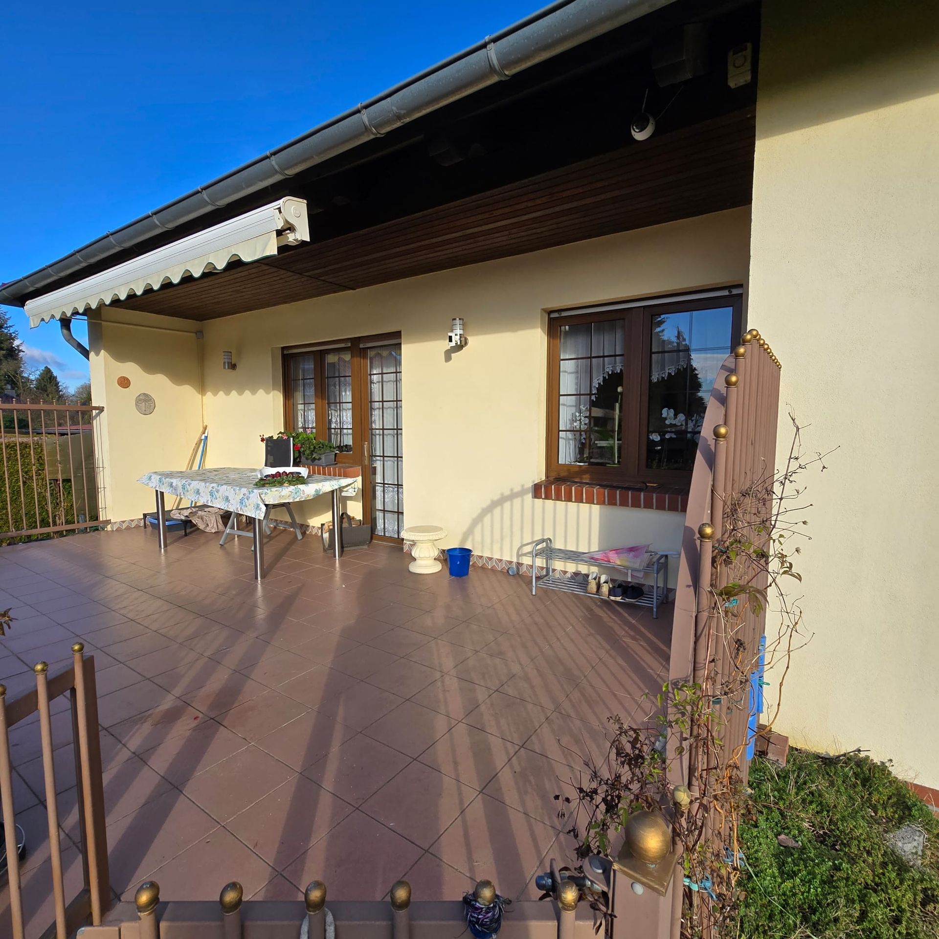 Ein Highlight des Grundstücks ist die rund 30 m² große, überdachte Terrasse, die mit Betonsteinen im Jahr 2007/2008 gestaltet wurde. Ob Familienfrühstück im Freien, gesellige Grillabende oder ein Glas Wein beim Sonnenuntergang – dieser Außenbereich wird schnell zum Lieblingsplatz.